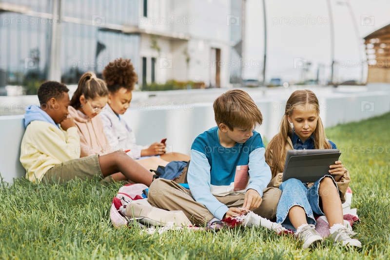 Два школьника-подростка смотрят на экран планшета, который держит девочка