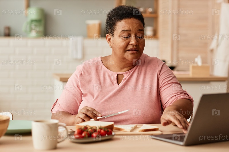 Чернокожая старшая женщина использует ноутбук во время завтрака