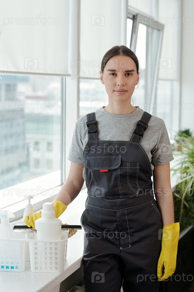 Молодая уборщица в комбинезонах и резиновых перчатках стоит на пороге офиса