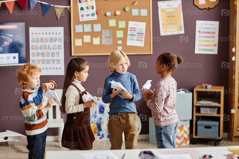 Группа из четырех маленьких учеников детского сада, играющих в бумажные самолеты
