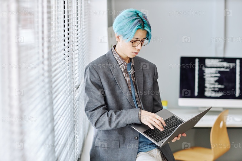 Молодой азиатский мужчина использует ноутбук, сидящий у окна в офисе