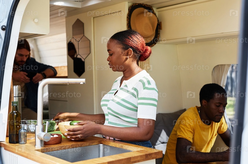 Женщина готовит в доме на колесах