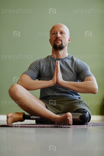 Взрослый мужчина с протезированной ногой наслаждается занятиями йогой в помещении и медитирует