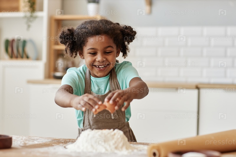 Счастливая маленькая девочка печет на кухне и ломает яйца в муке, делая тесто