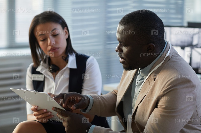 Чернокожий бизнесмен работает с молодой женщиной, просматривая документы в офисе