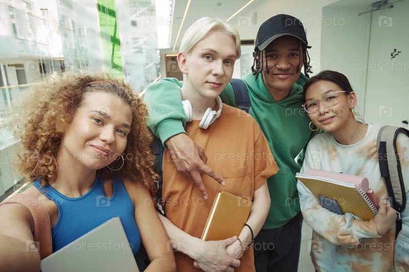 Две счастливые межкультурные пары подростков в повседневной одежде делают селфи на коридоре