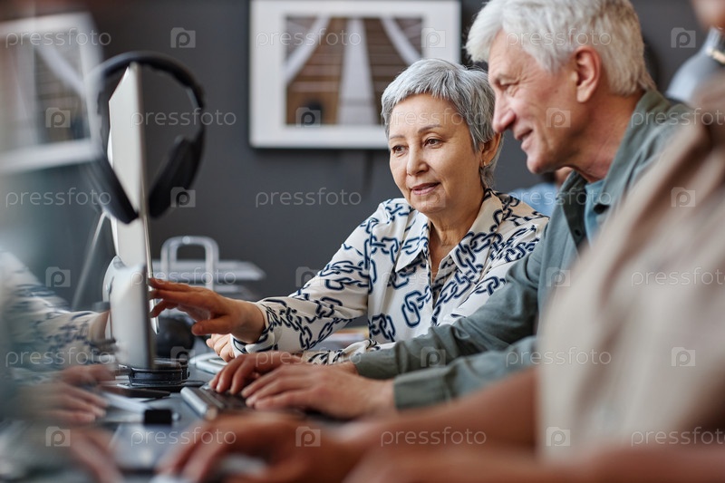 Мужчина и женщина старшего возраста смотрят на компьютерный экран в классе для пожилых людей