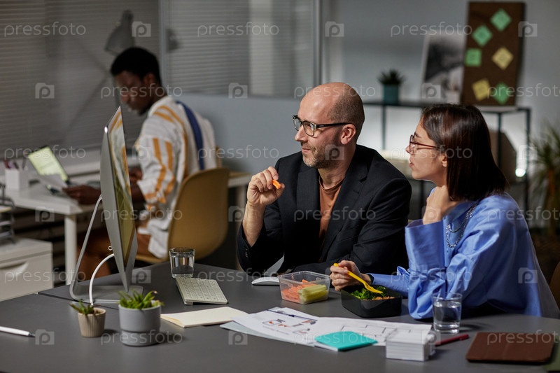 Улыбающиеся деловые люди наслаждаются поздней закуской в офисе