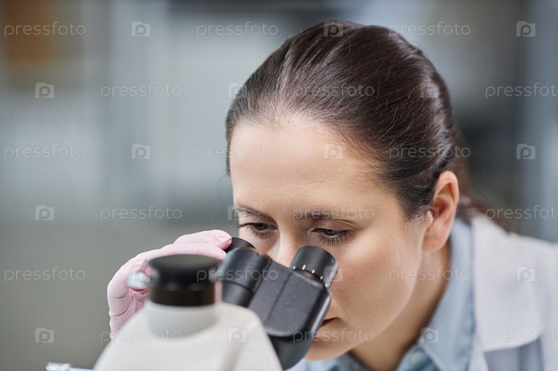 Молодая женщина-ученый смотрит под микроскопом в лаборатории