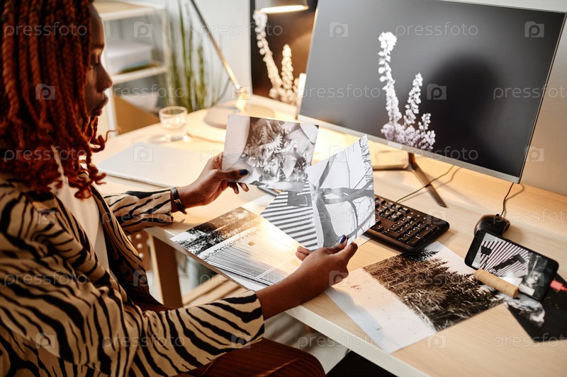 Женщина-фотограф, работающая с черно-белыми фотографиями