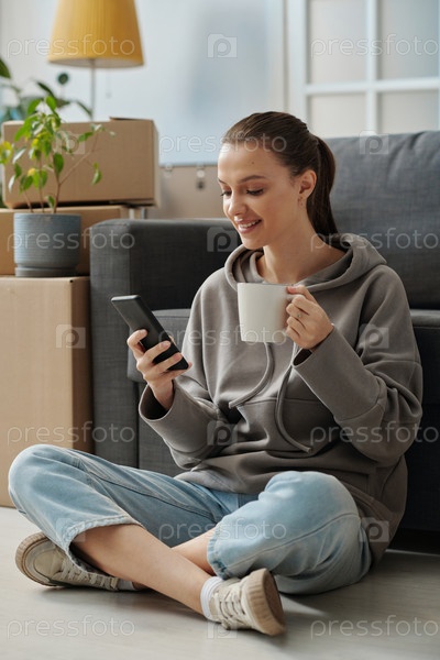 Женщина, разговаривающая по телефону и пьющая кофе
