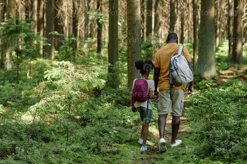 Папа с ребенком гуляют по лесу