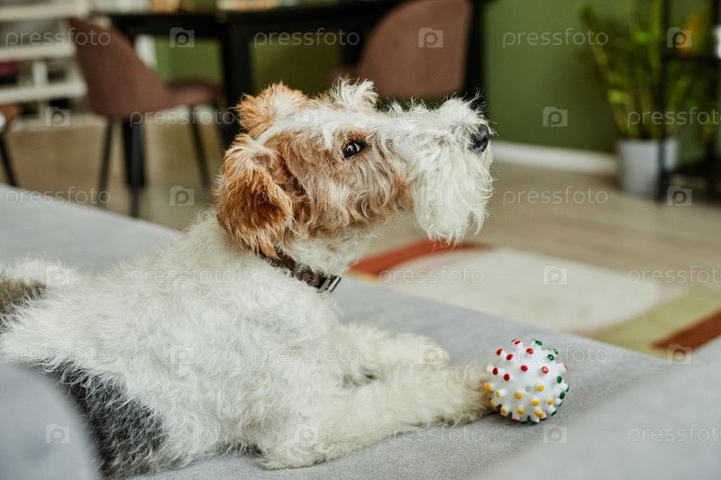 Милая собака с мячом на диване