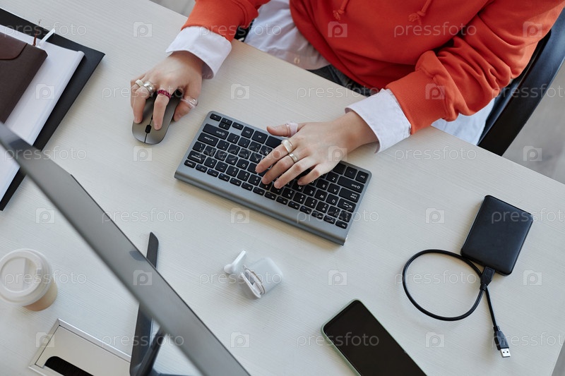 Выше вид рук молодой женщины-работницы белого воротничка, нажимающей клавиши