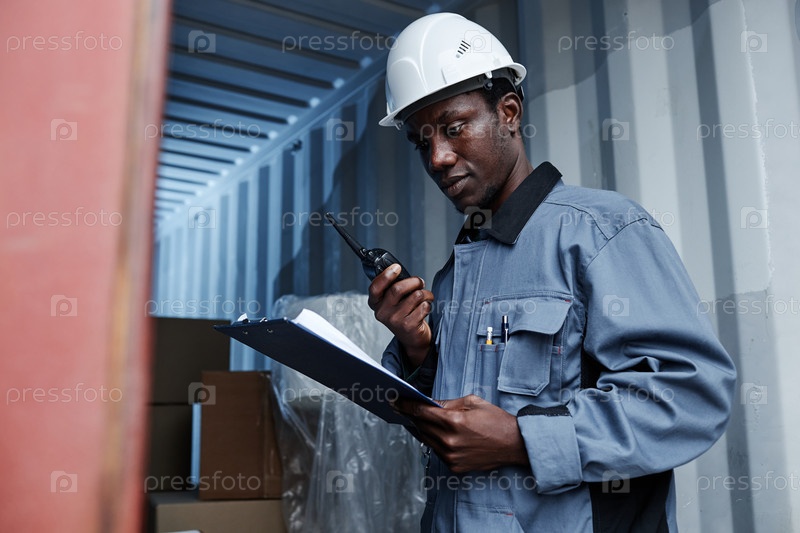 Работник-мужчина, проверяющий контейнеры в судоходном доке