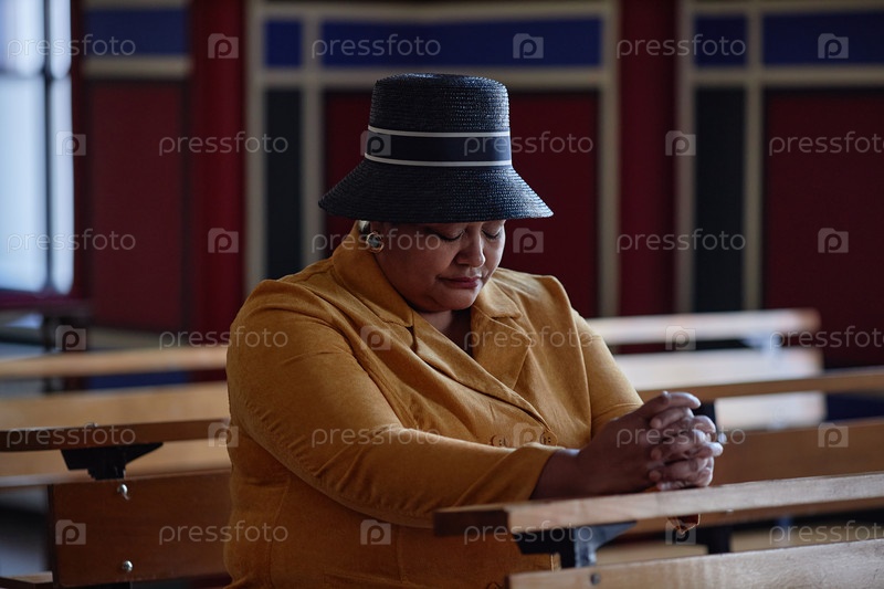 Женщина молится с закрытыми глазами в церкви