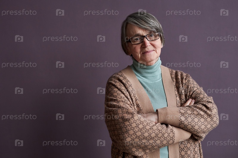 Пожилая женщина в очках смотрит на камеру, стоя с перекрещенными руками