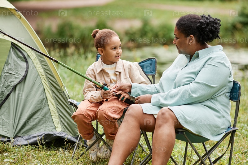 Мать и дочь, кемпирующие вместе на открытом воздухе и держащие в руках удочку