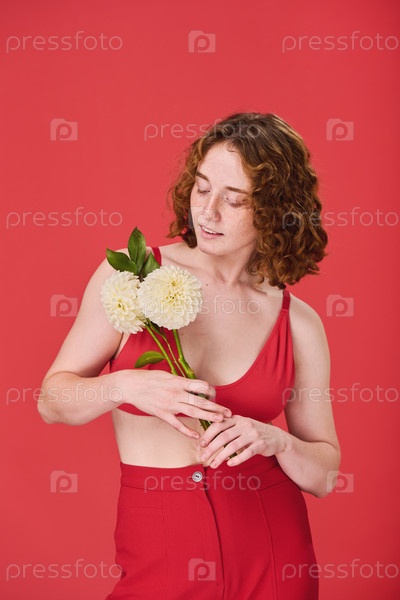 Молодая девушка позирует с белыми цветами