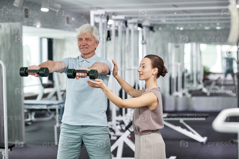 Молодая женщина обучается старшему мужчине физиотерапии