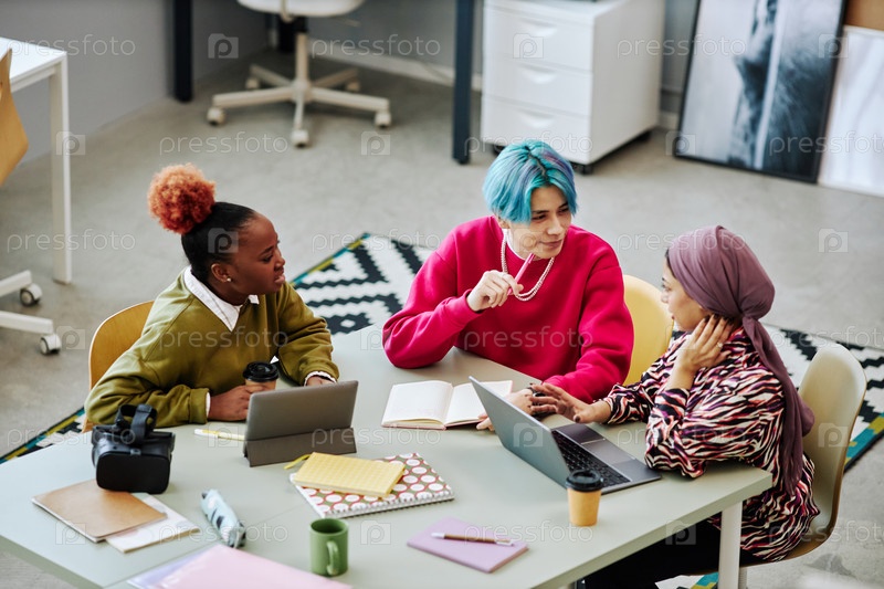Разнообразная группа творческих молодых людей обсуждает проект во время встречи