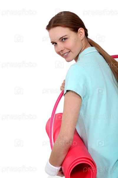 Женщина идет из тренажерного зала с матом и обручем