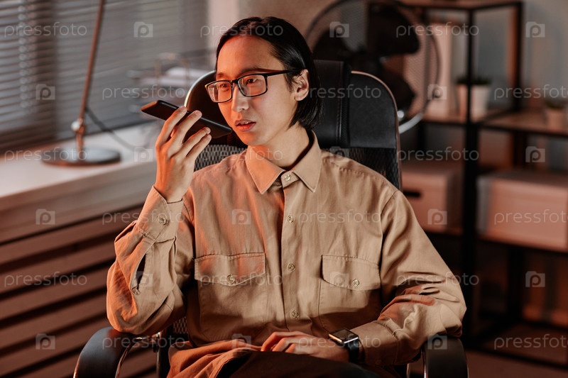 Молодой азиатский бизнесмен в очках и непринужденной рубашке записывает голосовое сообщение