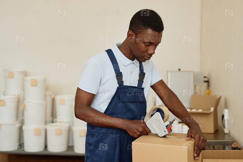 Минимальный молодой чернокожий мужчина, работающий на фабрике и записывающий упаковочные коробки