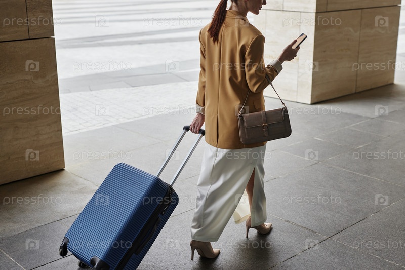 Задний вид молодой современной деловой женщины, тянущей чемодан и отправляющей сообщения