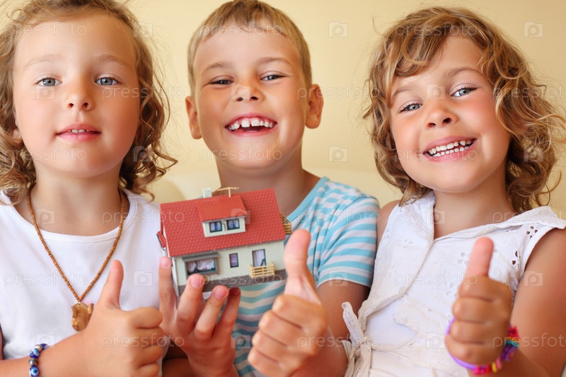 Две девочки и мальчик с игрушечным домиком показывают знак успеха