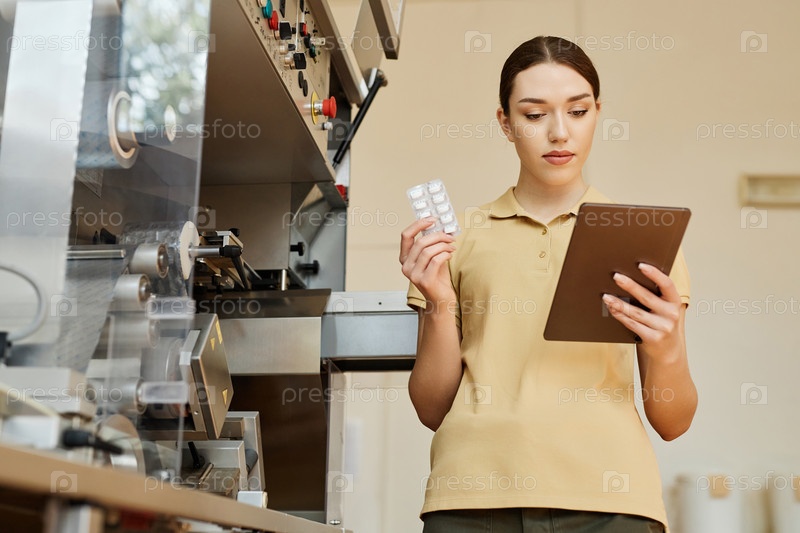 Молодая женщина использует цифровой планшет на фармацевтической фабрике