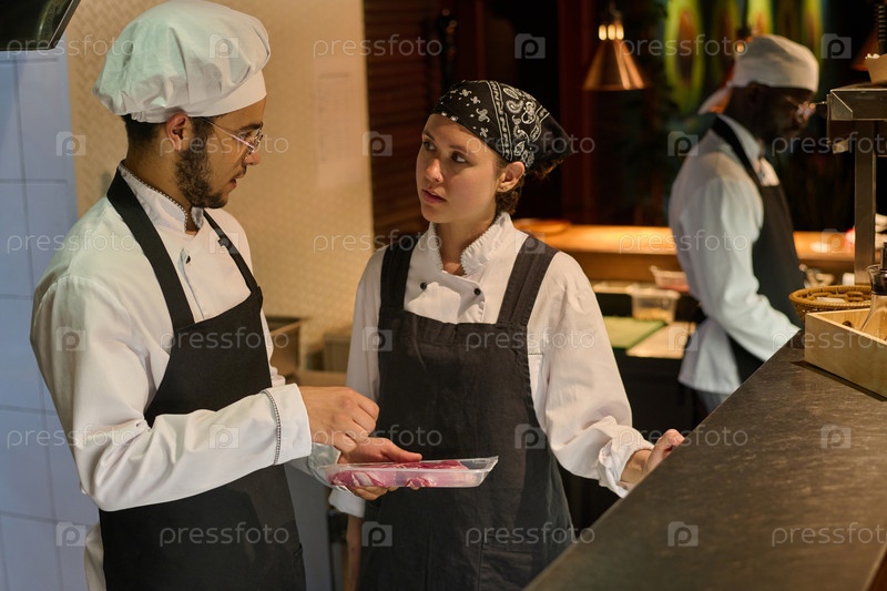 Молодая серьезная женщина в форме разговаривает с мужчиной поваром с мясом в контейнере