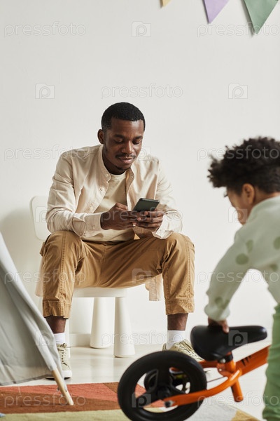 Молодой отец использует смартфон