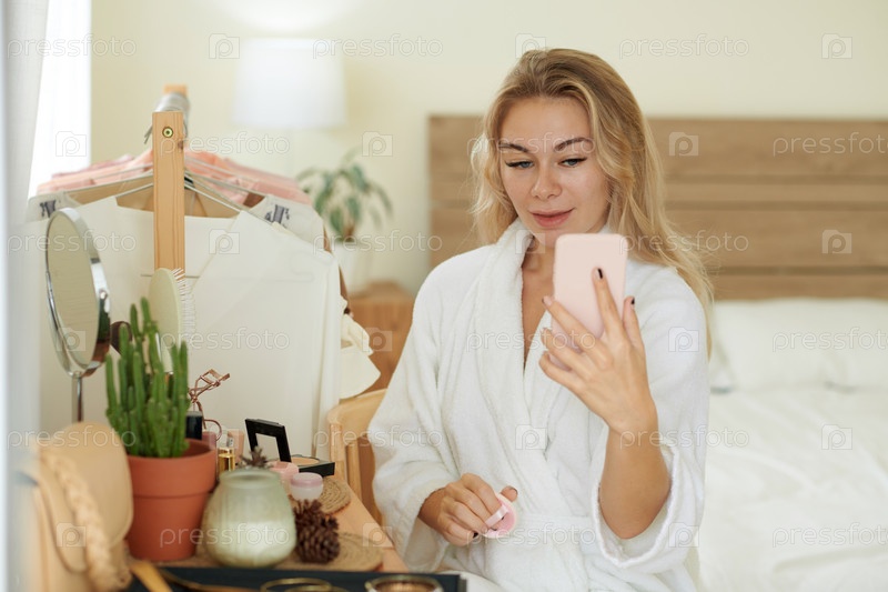 Женщина в халате делает селфи