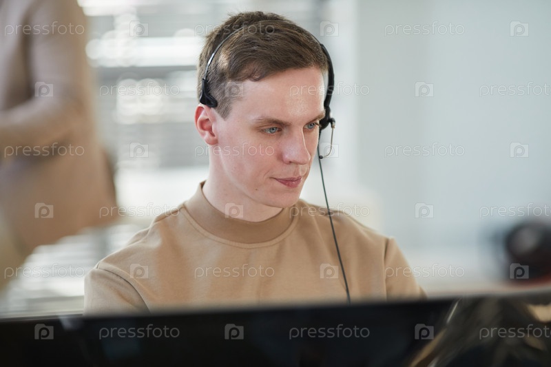Молодой человек в гарнитуре и смотрит на компьютерный экран