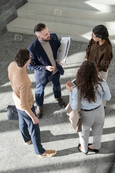 Молодые коллеги в формальной одежде стоят внутри большого офисного центра
