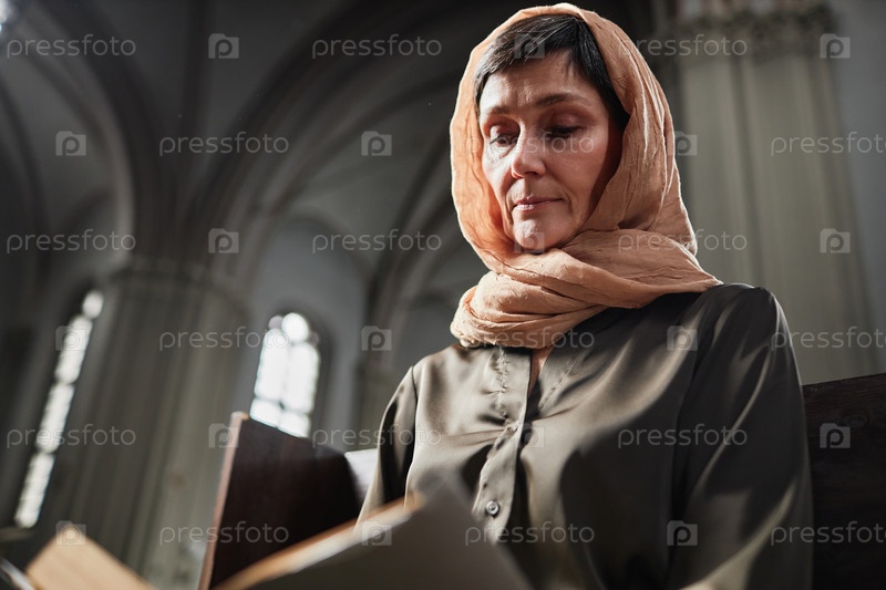 Зрелая женщина читает молитву в церкви