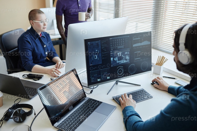 Сосредоточьтесь на экране компьютера с киберданными и ноутбуке на рабочем месте менеджера