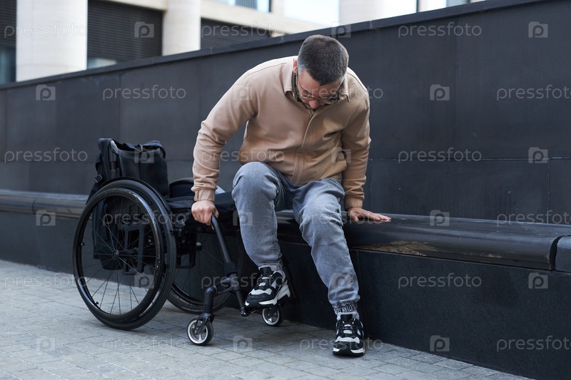 Человек с ограниченными возможностями пытается сесть в инвалидной коляске