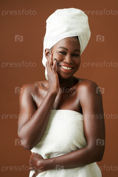 Позитивная женщина в ванном полотенце