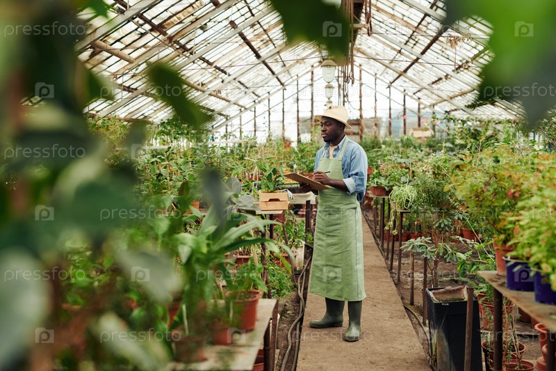 Черный мужчина, работающий в теплице