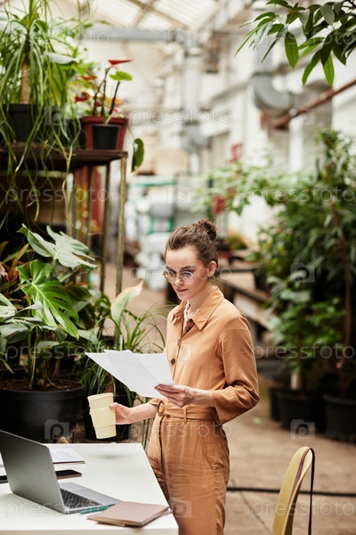 Молодая женщина-бухгалтер современной оранжерии или цветочного магазина
