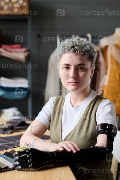 Молодая, серьезная женщина-ремесленница или дизайнер одежды сидит у рабочего места в студии