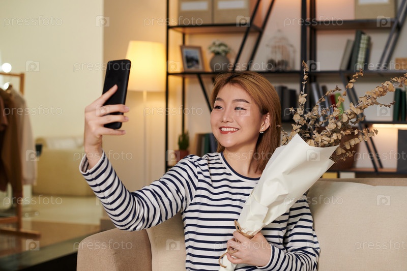 Женщина делает селфи с букетом цветов