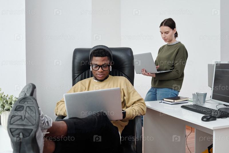 Молодые межкультурные разработчики с ноутбуками работают индивидуально в офисе