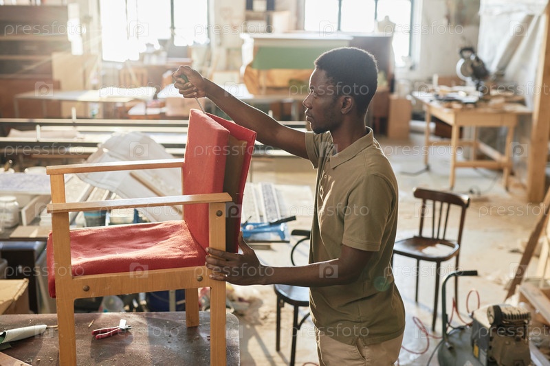 Чернокожий мужчина как ремесленник восстанавливает стул в столярной мастерской