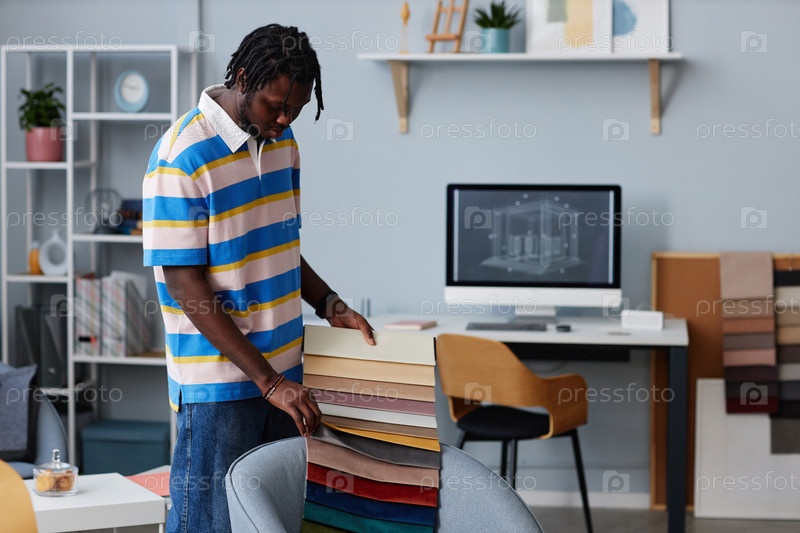 Афроамериканский дизайнер выбирает ткань для мебели