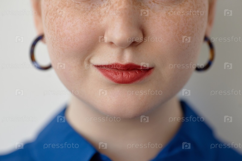 Ближайший снимок молодой рыжеволосой женщины, улыбающейся на камеру в красной помаде