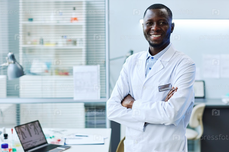 Улыбающийся чернокожий мужчина стоит в лаборатории