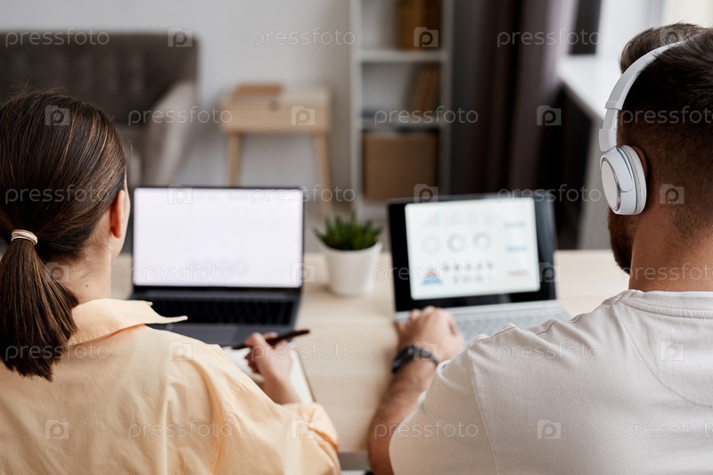 Выборочный фокус двух молодых коллег, работающих в сети перед ноутбуками